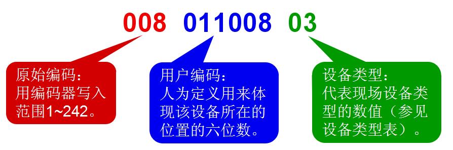 控制器所接的可編址外部設(shè)備均需進(jìn)行編碼設(shè)定,每個(gè)設(shè)備對(duì)應(yīng)一個(gè)原始編碼(一次碼,如下圖紅色數(shù)字)和一個(gè)用戶編碼(二次碼,如下圖藍(lán)色+綠色數(shù)字構(gòu)成完整的二次碼),設(shè)備定義就是對(duì)用戶編碼進(jìn)行設(shè)定。被定義的設(shè)備既可以是已經(jīng)注冊(cè)在控制器上的,也可以是未注冊(cè)在控制器上的。