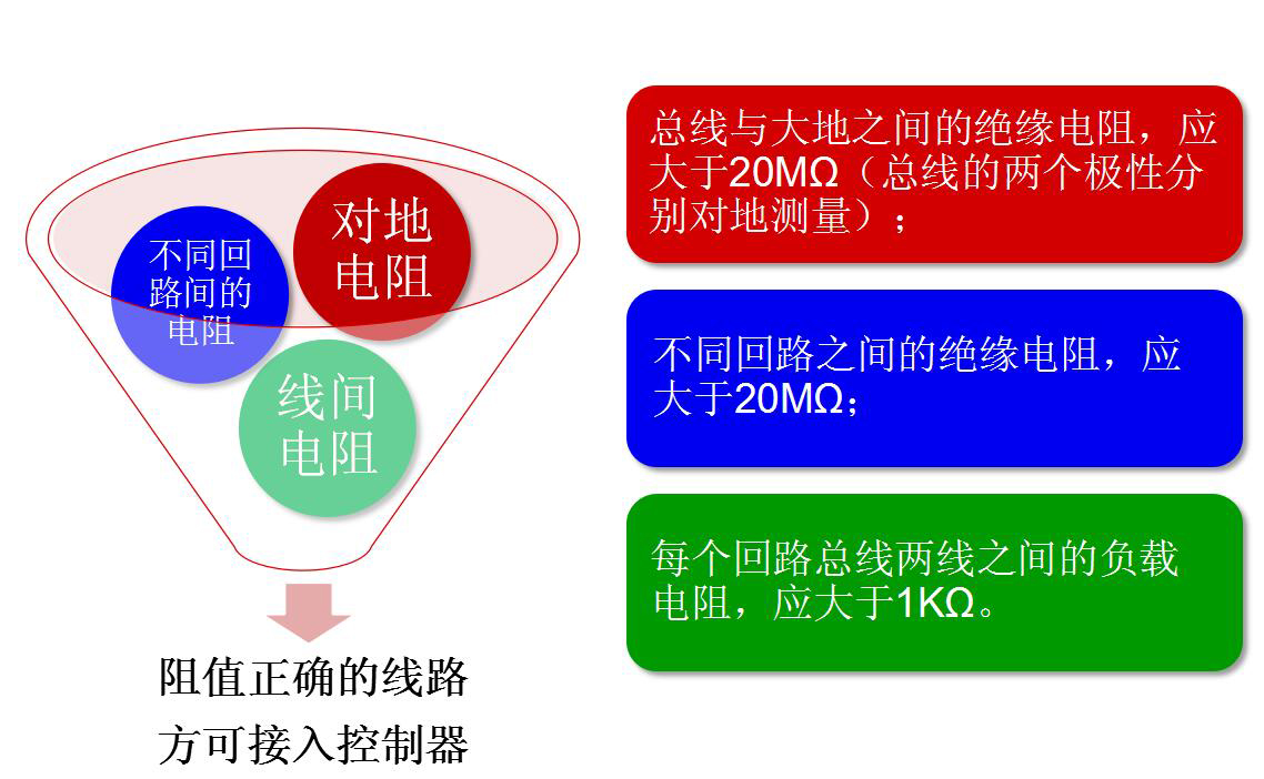 火災(zāi)自動(dòng)報(bào)警系統(tǒng)導(dǎo)線敷設(shè)后,在安裝現(xiàn)場(chǎng)設(shè)備之前,應(yīng)對(duì)每回路的導(dǎo)線用500V的兆歐表(搖表)測(cè)量絕緣電阻,其對(duì)地絕緣電阻值不應(yīng)小于20MΩ。接好設(shè)備后,用萬用表的歐姆檔檢查線間是否短路,阻值是否正常(大于1KΩ),線路是否接地(大于20MΩ)。有以上故障應(yīng)及時(shí)處理。