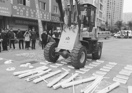 “銷毀!”3月14日上午9點半,在成都市金府機電城的廣場上,消火栓箱、防火門、排煙防火閥、消防水槍、灑水噴頭等消防產品擺了一地,但是和正規產品不同,現場的這8類消防產品,都是偷工減料的偽劣品。