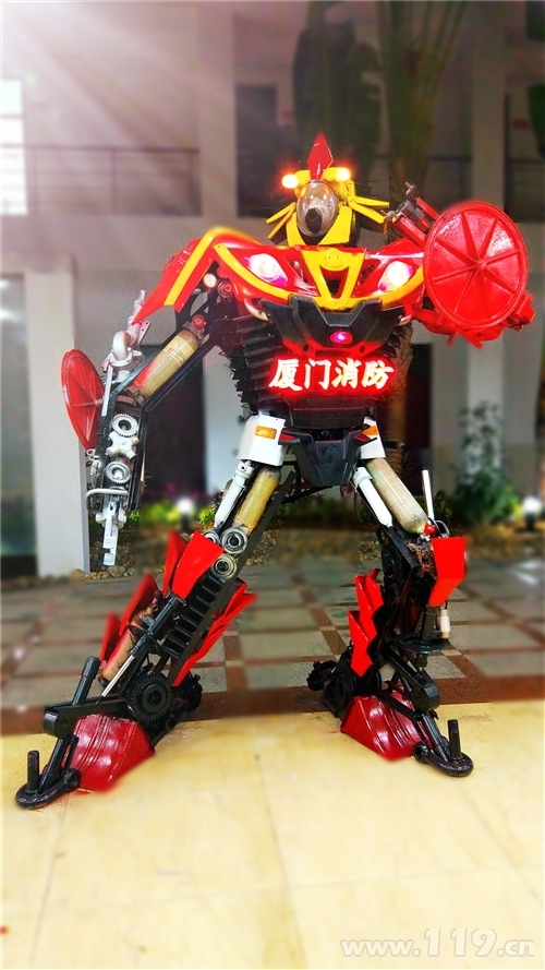消防機器人模型的制作不僅體現了戰保官兵節約資源廢物再利用的環保理念,充分展示了官兵創新思維以及高超的機械動手制作能力,更是作為廈門消防對外宣傳的一張名片。